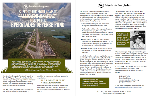 The Friends of the Everglades have recently created the Everglades Defense Fund, with a goal of raising $2M over the next 12 months to be used in the legal effort that includes the Center for Biological Diversity, Earthjustice and other conservation colleagues.
